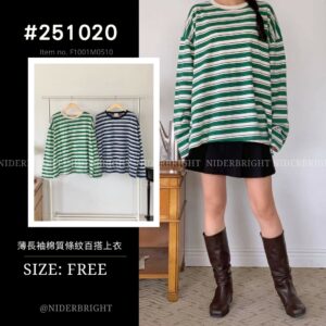 2510#20 圓領 棉質 寬鬆 長版 條紋 薄長袖 上衣