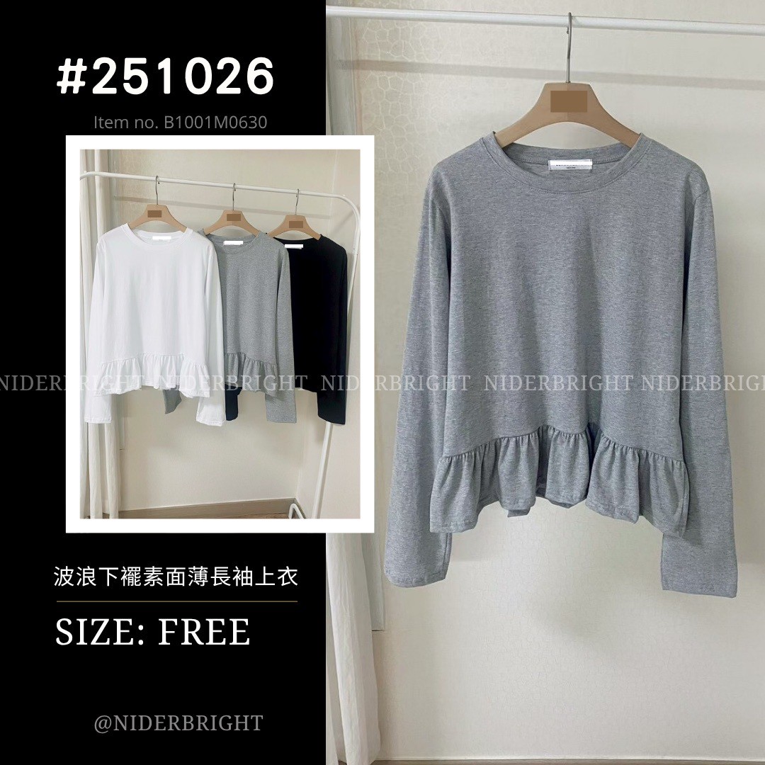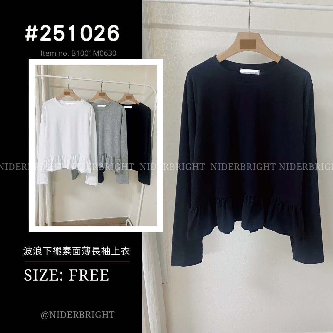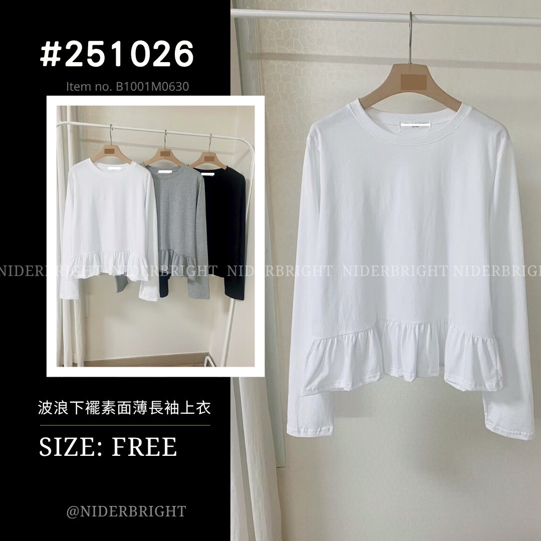 / 2510#26 圓領 波浪下襬設計 素色 棉質 薄長袖 上衣